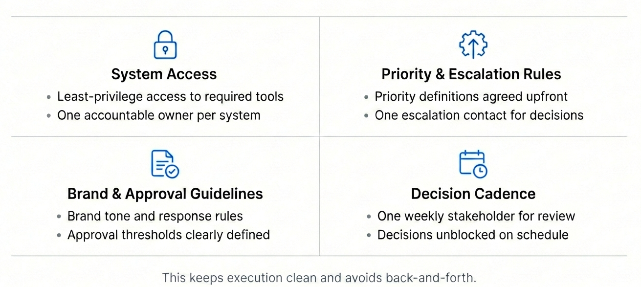 - Brand tone and approval rules (where required)
