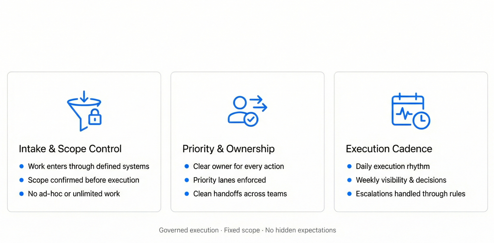 Enterprise engagements include a governance rhythm—weekly exceptions review and a monthly operating review—to keep standards, reliability, and visibility tight at scale.