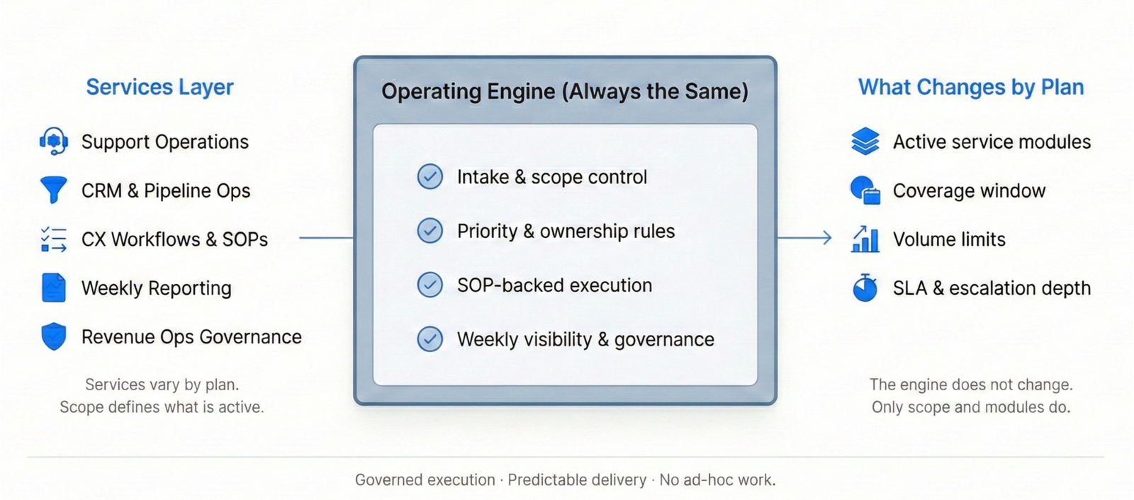 A consistent system of rules, lanes, cadence, and reporting. The engine stays the same; only the scope (modules, volume, coverage) changes.