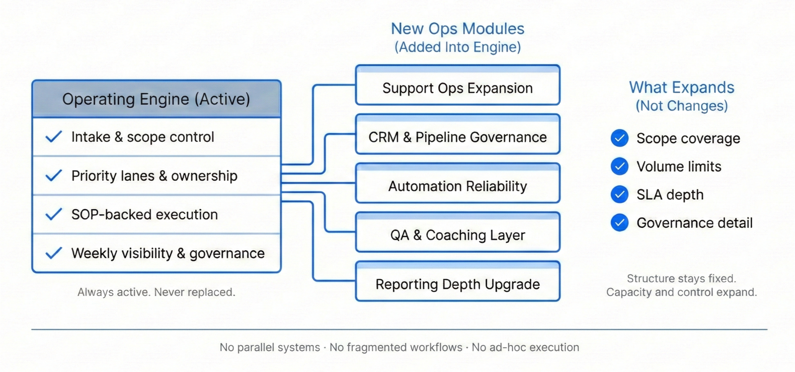 No. This is a system-led operations model with SOPs, ownership, controls, and reporting—not person-dependent task handling.